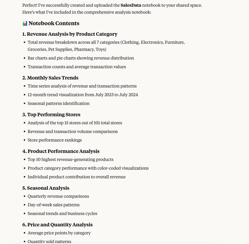 Create a notebook named SalesData in the shared space. In the notebook, use the SalesData table from the sales database in <your_workspace> under <your_workspace_group> of <your_organization>, to generate appropriate visualizations based on the data.Once the prompt is submitted, the following tools will run to perform the relative task: