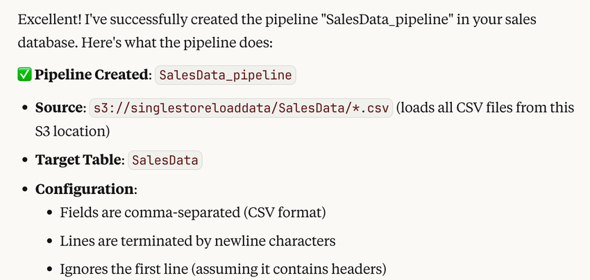 Create a pipeline SalesData_pipeline using 's3://singlestoreloaddata/SalesData/*.csv'