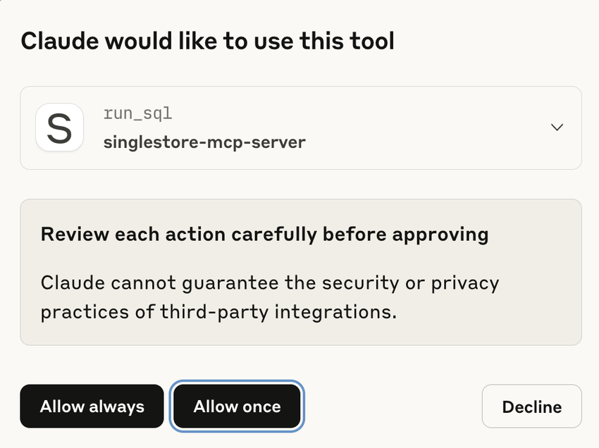 When using third-party tools such as Claude with the SingleStore MCP server, a permission prompt appears requesting access to run actions like run_.