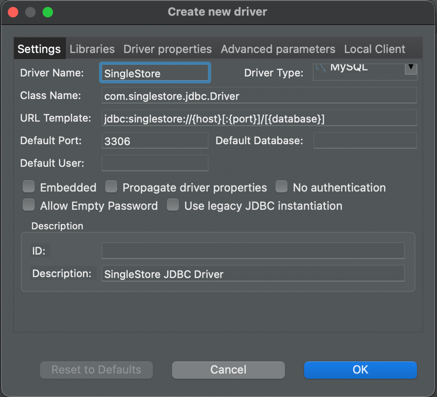 Class Name: Specify the Class Name for the SingleStore JDBC driver: