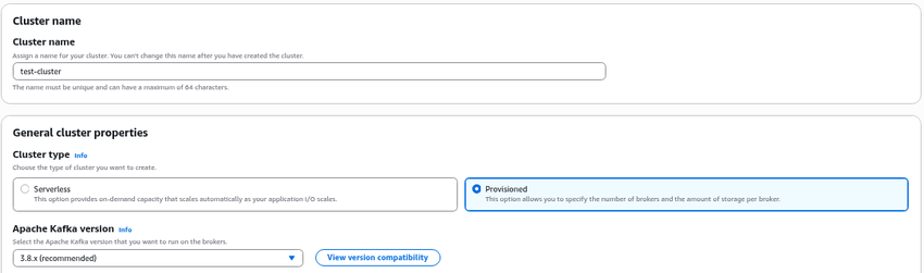 Create a Kafka cluster in AWS MSK with Provisioned cluster type.