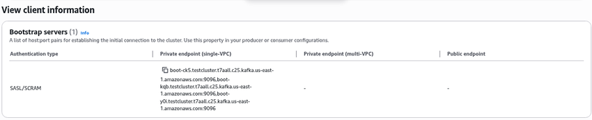 Get the SASL/SCRAM endpoints from the Kafka cluster summary in View Client Information.