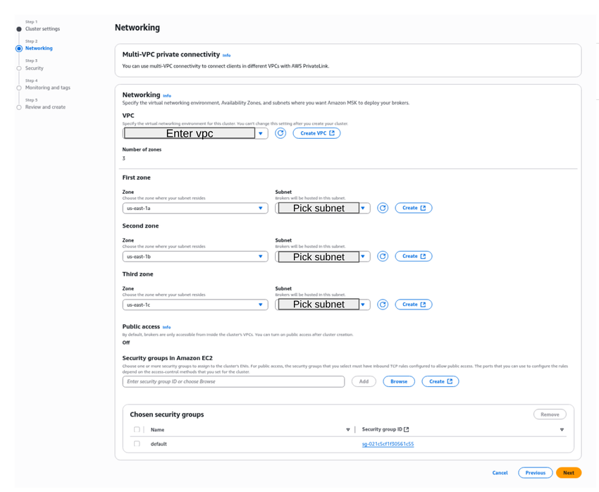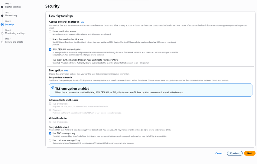 To set up a Kafka cluster in AWS MSK, perform the following steps: