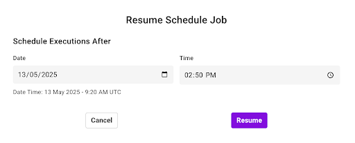 To resume an existing job, navigate to the Jobs page, select the ellipses in the Actions column of the job, and select Resume.