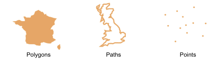 The three main geospatial object types are points, paths, and polygons.Well-Known Text