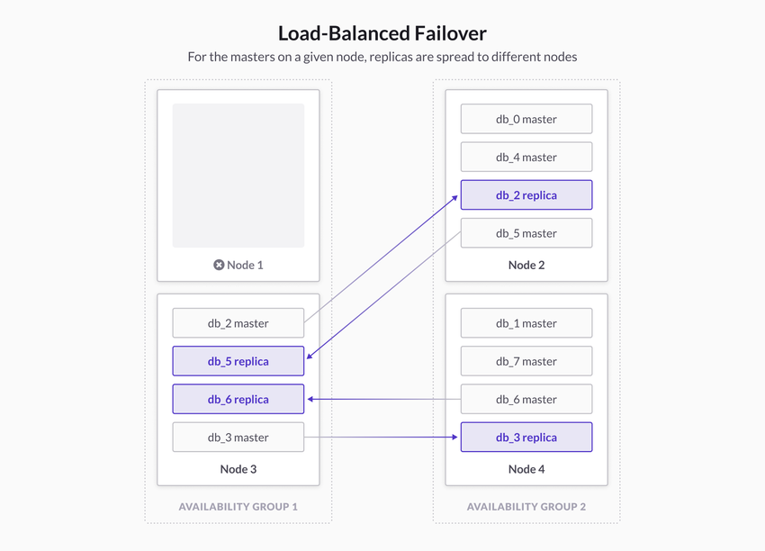 If Node 1 fails in this setup, SingleStore promotes the replica of db_0 on Node 2 to primary and the replica of db_1 on Node 4 to primary.