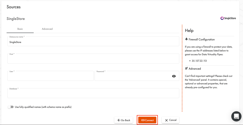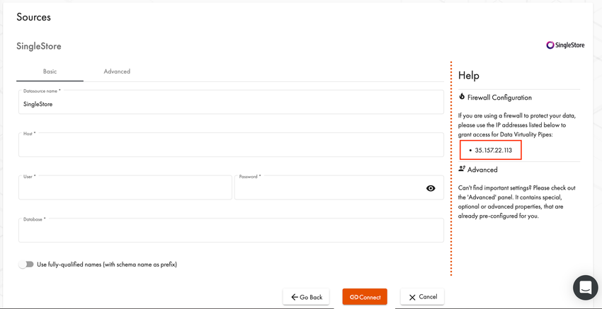 You can find the Data Virtuality Pipes IP address on the SingleStore source screen, in the Help pane, under Firewall Configuration.