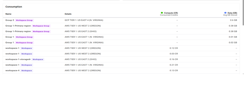 For the workspace group, Group 1 - Primary Region (AWS TIER 1: US WEST 2 (OREGON)), the data storage graph shows: