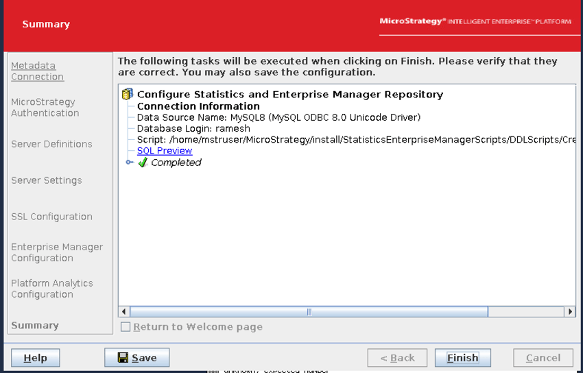 MicroStrategy will run the scripts and confirm completion. Click Finish.