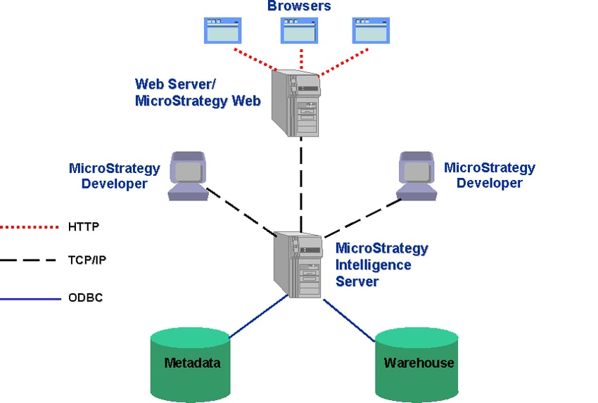 The second tier consists of MicroStrategy Intelligence Server also called I-server, which runs your reports, dossiers, and documents against the data warehouse.