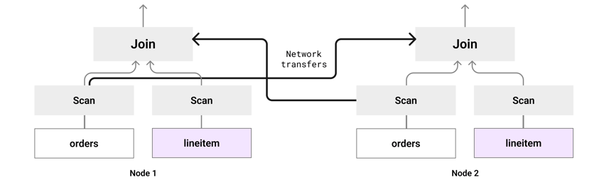 250 msThe image below illustrates the execution of this query.order_ (the JOIN column) is not the shard key for the orders table, rows from orders need to be transferred between nodes so that all rows from orders with a particular value of order_ are on the same node as with rows from lineitem that have that same value of order_.