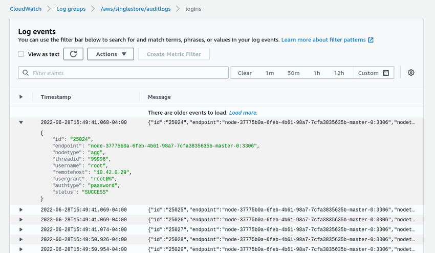 {"id": "28179","endpoint": "node-37775b0a-6feb-4b61-98a7-master-0:3306","nodetype": "agg","threadid": "99996","username": "root","remotehost": "localhost","usergrant": "root@%","authtype": "password","status": "SUCCESS"}